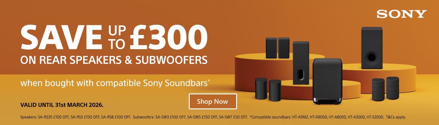 Save Up To £300 On Rear Speakers & Subwoofers When Bought With Any Sony Dolby Atmos Soundbar OR Home Theatre System.