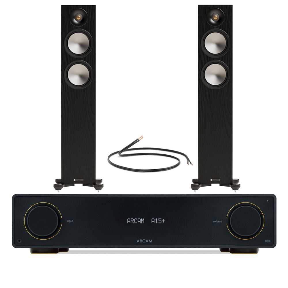 Arcam A15+ Integrated Amplifier with Monitor Audio Bronze 300 7G Floorstanding Speakers – Black HiFi Package