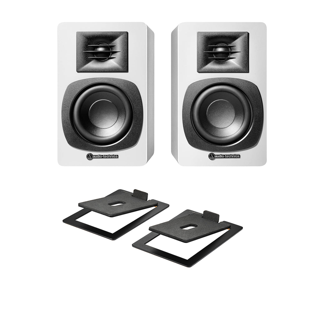 Audio Technica AT-SP3X Powered Bluetooth Bookshelf Speakers in White with AT-ST3 Stands