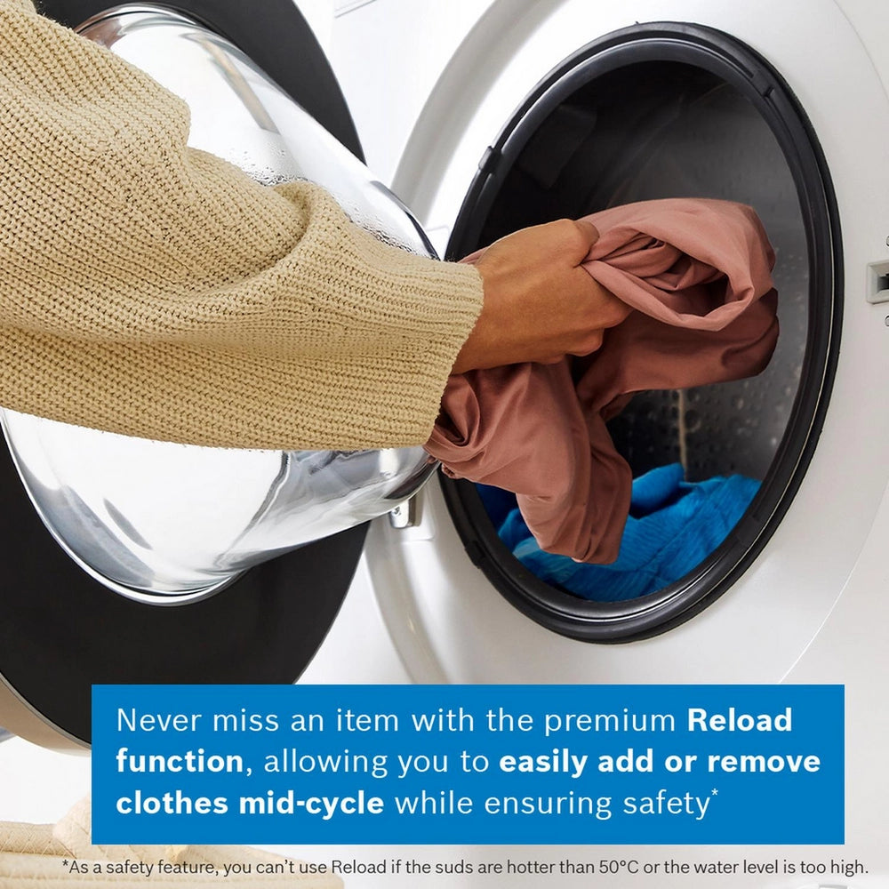 Forgot to add a sock, or a stray t-shirt? No problem! The Reload function lets you easily add or remove clothes during wash cycles*. Just press the Reload button and open the door, then add your forgotten items and continue the wash. *As a safety feature, you can’t use Reload if the suds are hotter than 50°C or the water level is too high.