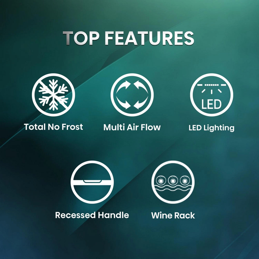 No Frost technology prevents ice build-up. Enjoy hassle-free maintenance Multi Air Flow for even cooling throughout – Ensures freshness for longer LED lighting, bright and efficient storage space 50/50 design – Balances refrigeration and freezing space |