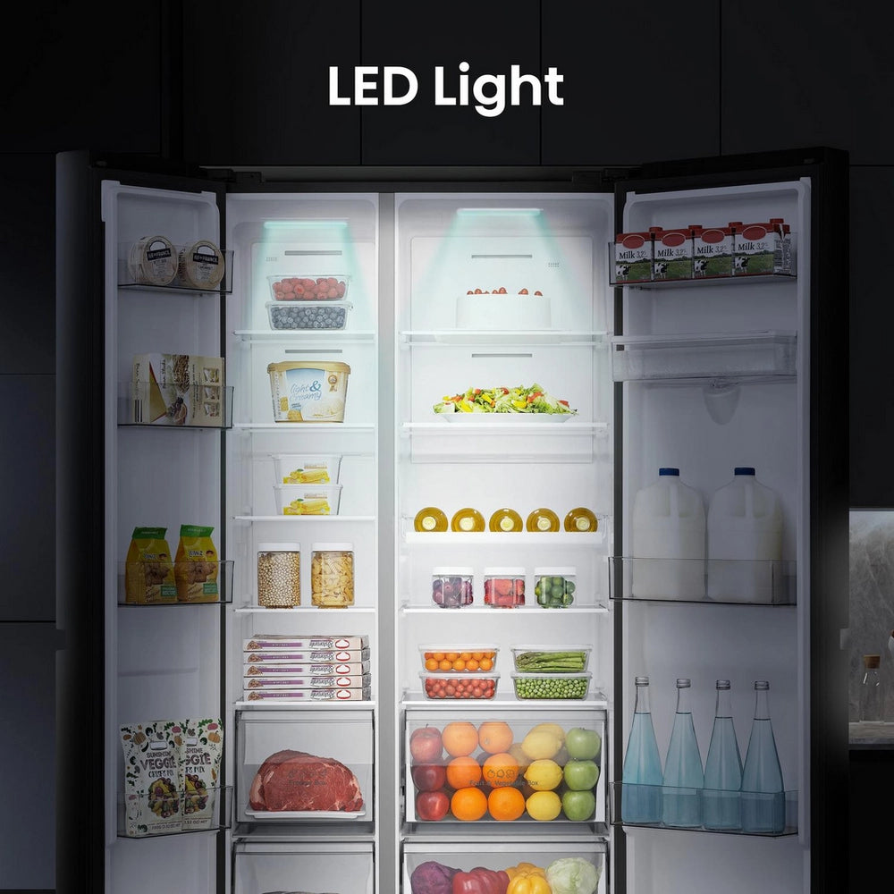 If you’ve ever found yourself juggling groceries just to make space in your fridge, you’ll know how frustrating it is. That’s where the Hisense RS840N4WFE American Fridge Freezer really shines. It’s big, bold, and practical, with a black stainless-steel finish that makes it look as sleek as it is functional. At 647 litres, this is the kind of appliance that eats weekly shops for breakfast — there’s room for everything, from fresh fruit to family-sized packs of frozen food.