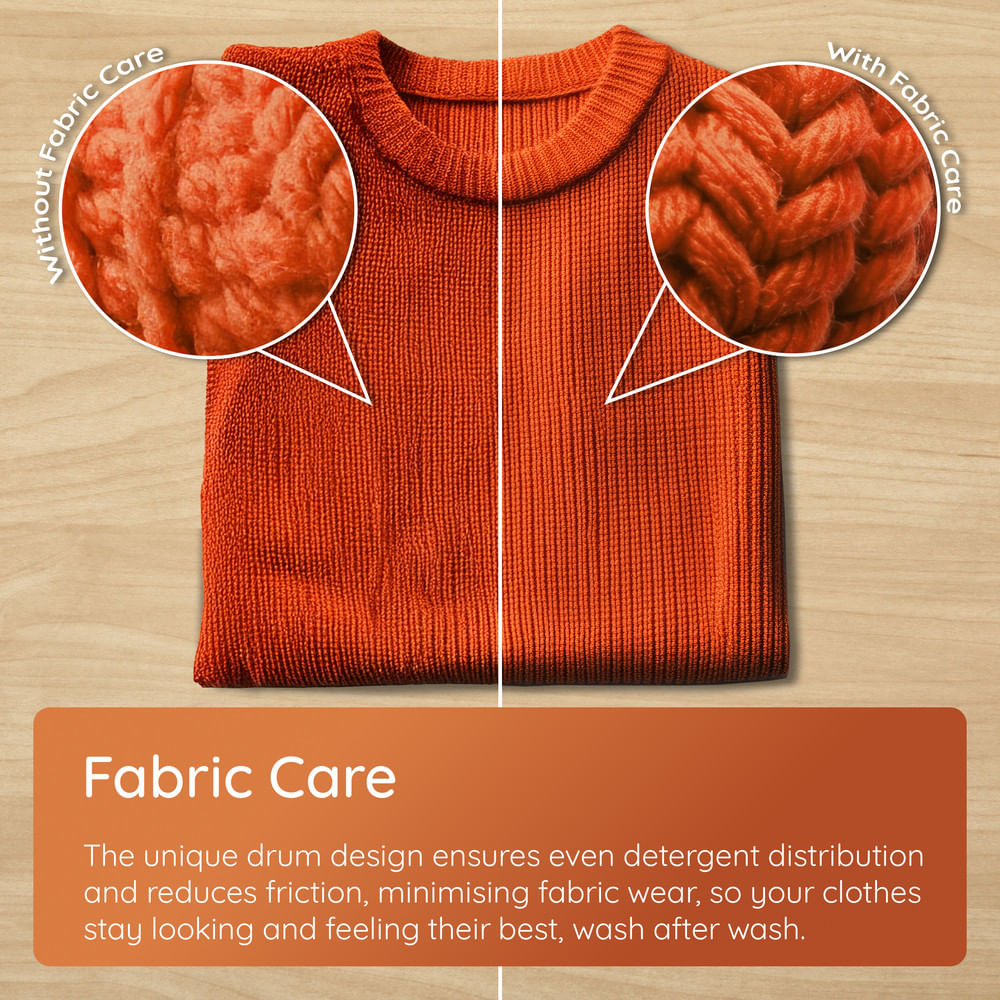 Fabric Care technology uses a specially designed drum that reduces friction between fabrics during the wash. By ensuring even detergent distribution and smoother drum movement, it minimises fabric stress and wear, helping clothes retain their softness, shape, and appearance wash after wash.