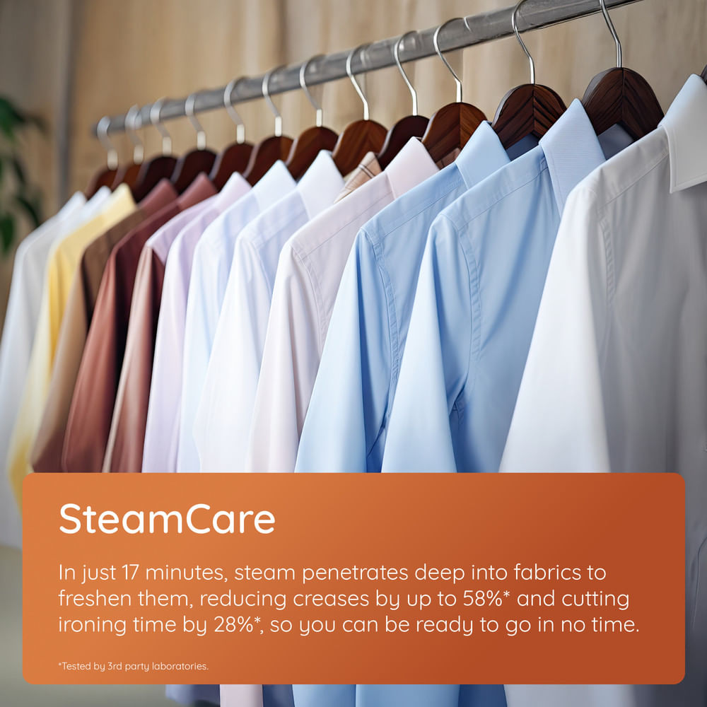 SteamCare is perfect for items that don’t need a full wash. Steam penetrates fabrics to reduce odours, soften fibres, and cut down creases, helping reduce ironing time while using less water and detergent.