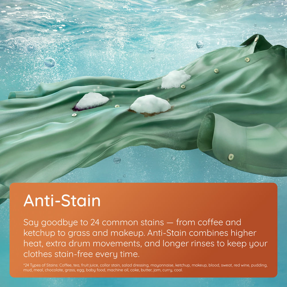 The Anti-Stain cycle targets up to 24 common household stains without the need for pre-treatment. By combining optimised temperature, drum movement, and rinsing, it lifts tough marks efficiently, saving time and reducing the need for repeat washes.