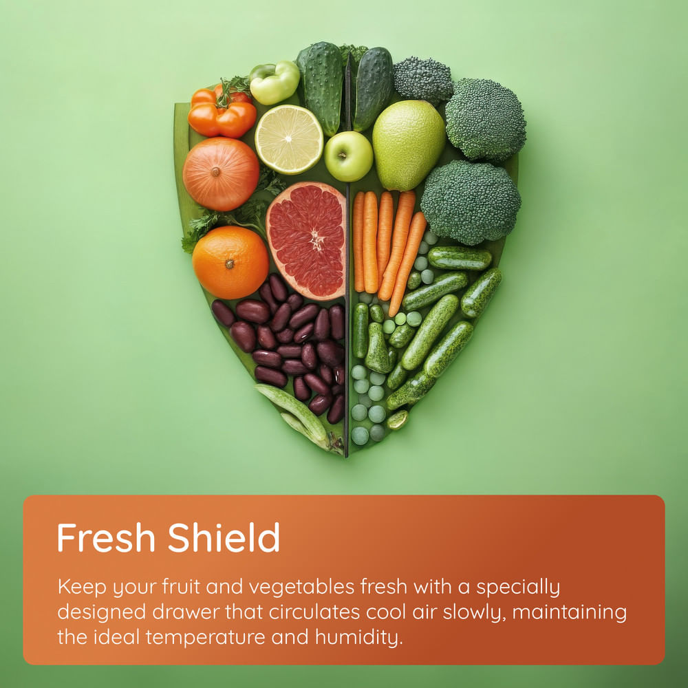 Inside the fridge, two specially designed FreshShield drawers create the ideal environment for storing fruit and vegetables. These drawers slowly circulate cool air while maintaining balanced temperature and humidity levels, helping prevent water droplets from forming.