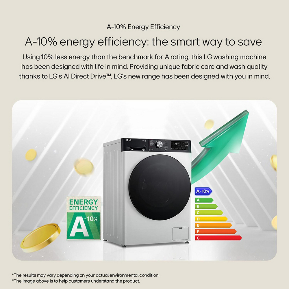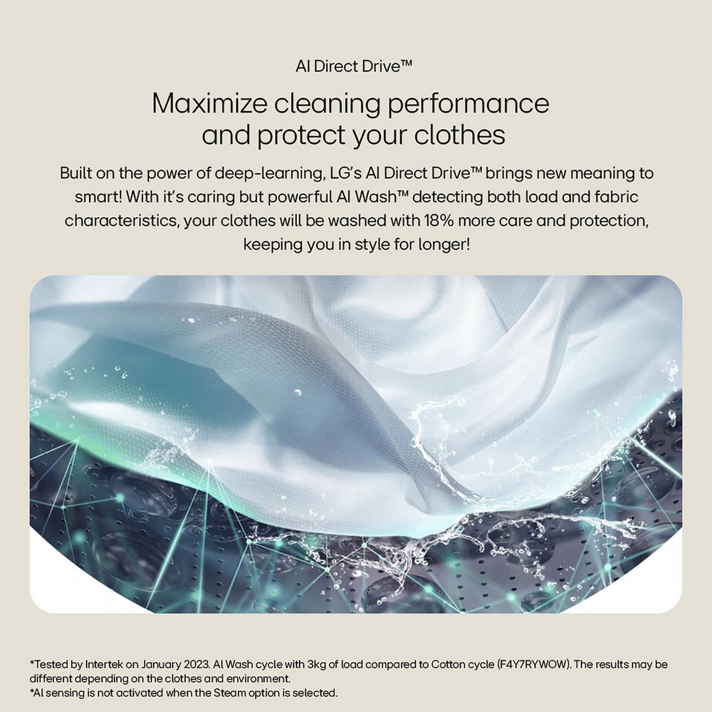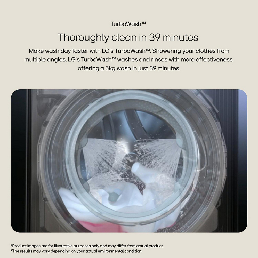 LG's Steam™ technology uses powerful sanitizing steam to reduce allergens by up to 99.99% Blitz through a 5kg load in just 39 minutes with TurboWash™ tech LG AI Direct Drive™ detects load and fabric characteristics to offer 18% more fabric care. 6Motion Direct Drive uses 6 types of drum movement to give your clothes a thorough clean |