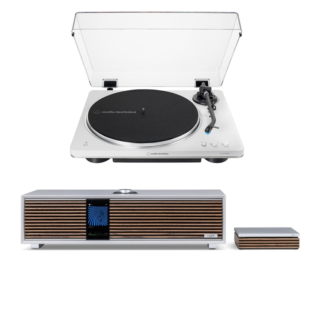 This carefully matched audio package combines modern streaming, classic CD playback and vinyl listening in one elegant system. Featuring the Ruark R410 Integrated Music System, the Ruark R-CD100 CD Player and the Audio-Technica AT-LP70XBT turntable, it delivers rich stereo sound with effortless usability and timeless design.
