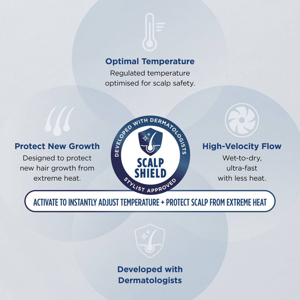 Scalp comfort and protection are front and centre with Scalp Shield Mode. Activated when required, this mode reduces air temperature instantly to an optimum level for scalp comfort and root drying. Developed with dermatologists and approved by stylists, Scalp Shield Mode is specifically designed to protect new hair growth from extreme heat, offering a considered option for those with delicate scalps or freshly grown hair.