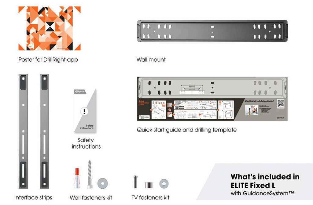 Wall mount, Wall mounting kit with fischer® Duo Power plugs, TV fasteners kit, Quick Installation Guide, DrillRight app, Drilling template |